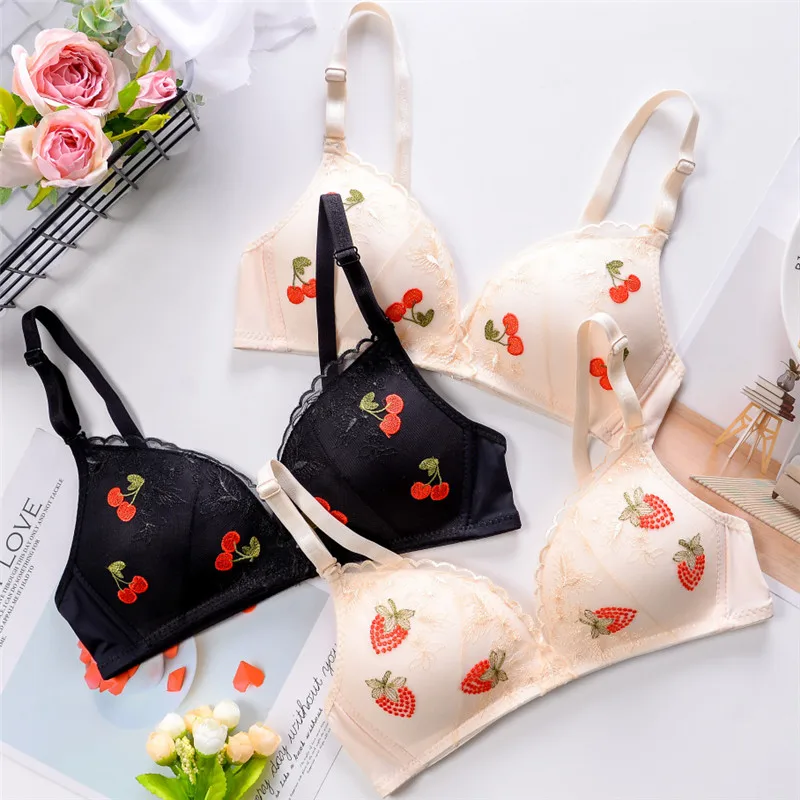 Лидер продаж, Женский комплект нижнего белья, беспроводной Ультра-тонкий комплект с бюстгальтером с вышитыми фруктами и цветами, сексуальн...