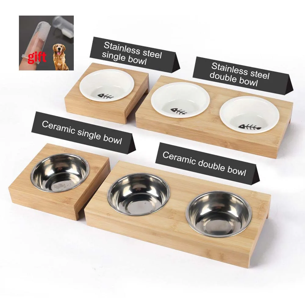 Новая кошачья собачья из нержавеющей стали/керамические миски для кормления и питья комбинация с бамбуковой рамой аксессуары для домашних ...